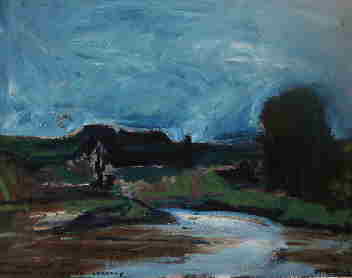 Mit meinen Soehnen paddelte ich im Sommer 2003 die Fulda und Weser zwischen Kassel und Hameln. Im Skizzenbuch faste ich den Augenblick. Später in Berlin nahm ich Leinwand und Farbe und schuf die Erinnerung.